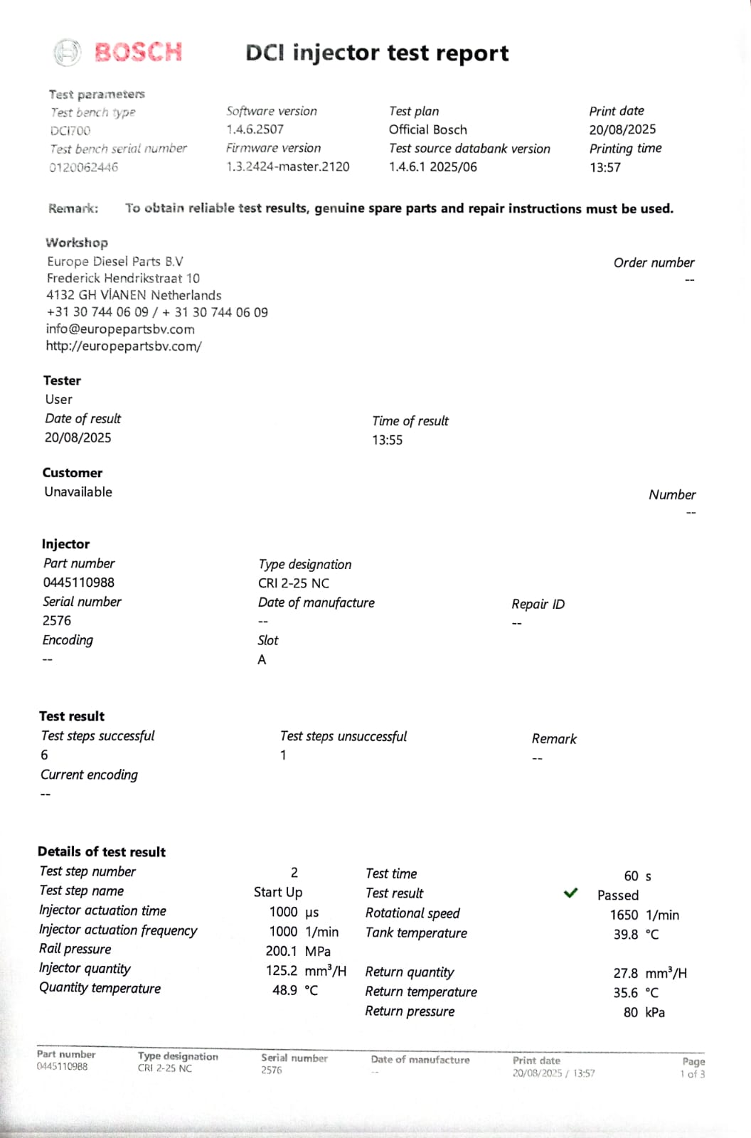 Reman Bosch Injector 0445110988 03N130277L 65.10100-6006 For Volkswagen T6 Crafter MAN TGE 2.0 TDi