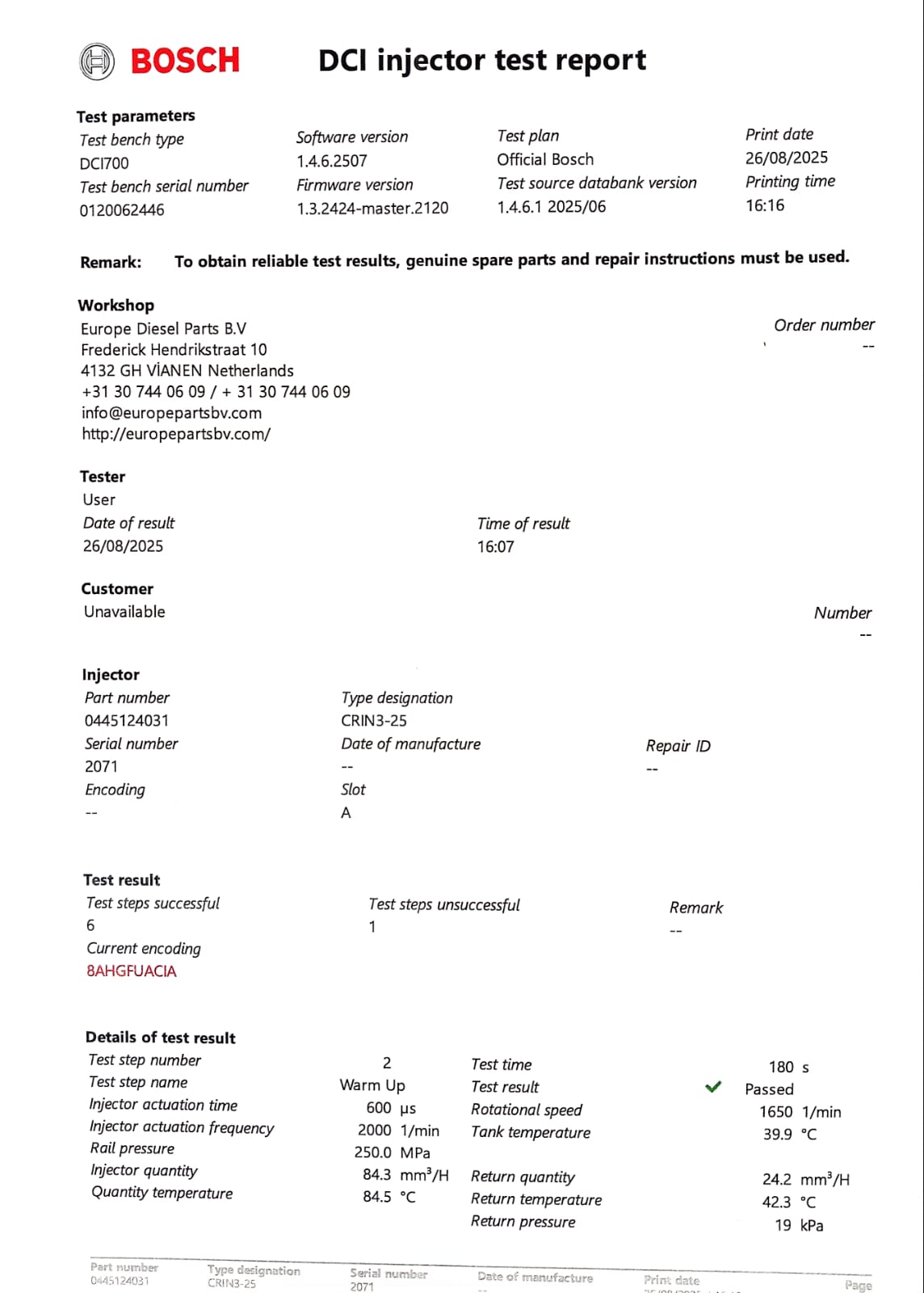 Reman Paccar Daf 2047600 2411620 Diesel Smart Injector Euro 7
